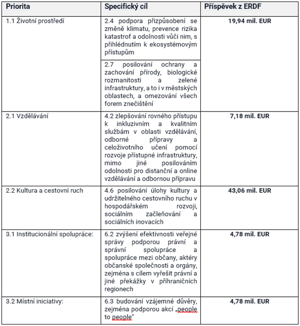 Socioekonomická analýza programového území identifikovala spektrum potřeb území, které mohou být řešeny prostřednictvím přeshraniční spolupráce. Ty jsou zohledněny v prioritách a specifických cílech programu: