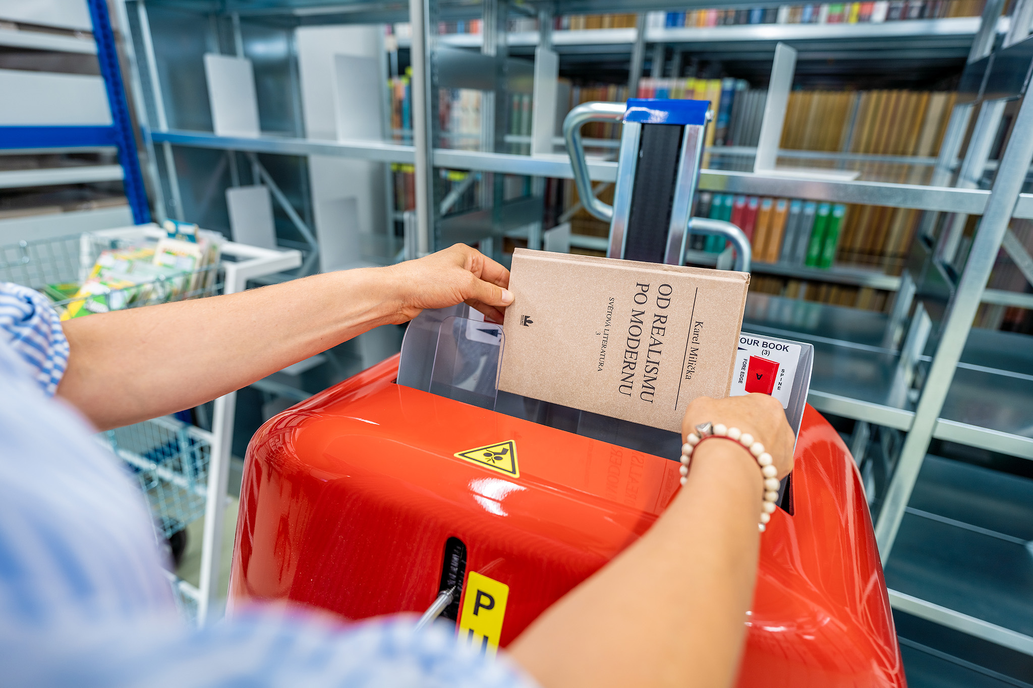 Cílem realizace tohoto projektu je vybudování komplexního pracoviště sloužícího k uložení, zpřístupnění a ochraně knihovního fondu. V oblasti uložení fondu bude tento cíl naplněn doplněním systému posuvných regálů ve skladu C a E. Součástí skladového vybavení bude sada knihovních vozíků, bude pořízen knižní skener a zařízení na odprašnění knih.